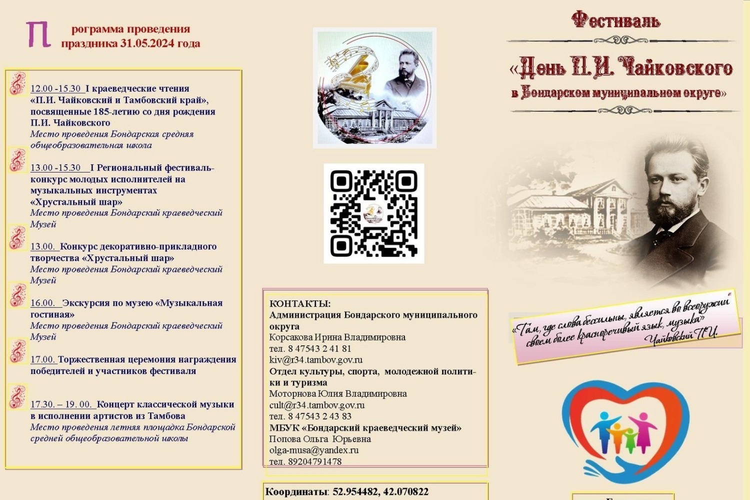Ставший традиционным фестиваль классической музыки имени Петра Чайковского (0+) в Бондарском муниципальном округе состоится в этом году 31 мая. В программу фестиваля включены краеведческие чтения, посвященные 185-летию со дня рождения Чайковского, региональный фестиваль молодых музыкантов, конкурс декоративно-прикладного творчества, а также экскурсия по Бондарскому краеведческому музею.