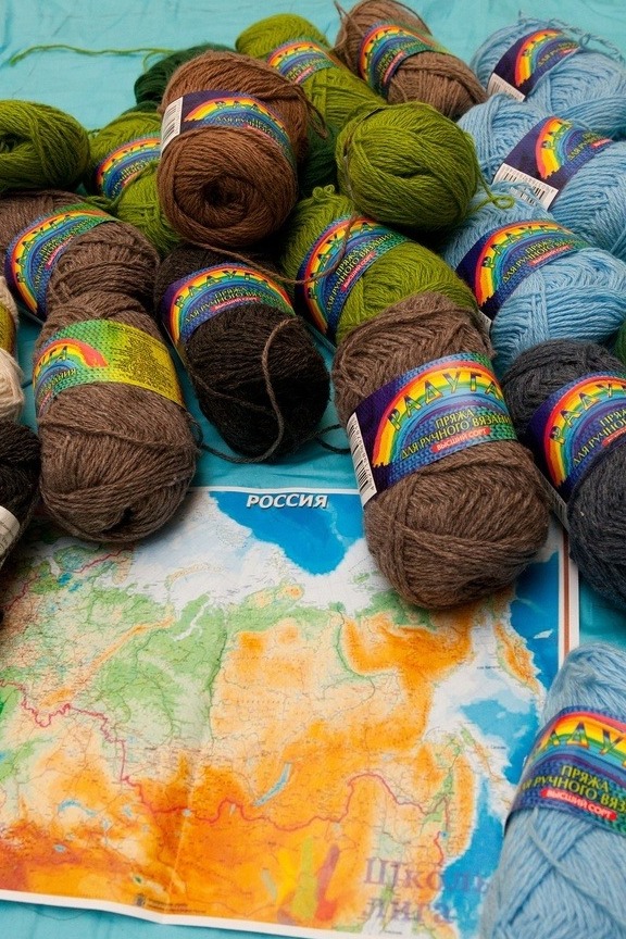 Основой для большой «теплой» карты страны стала физическая карта Российской Федерации. Именно по ней будут вывязывать географические объекты. Физической основой карты стал большой отрез голубой хлопковой ткани. Зеленые участки вывязывают пряжей самых разнообразных зеленых оттенков. На старте мастерицы закупили 10 кг пряжи. Длинные полоски из пряжи синих и голубых оттенков тоже готовы — это будущие реки на карте. Уже сделаны заготовки Енисея, Лены, Иртыша, Оби, Волги, Амура.