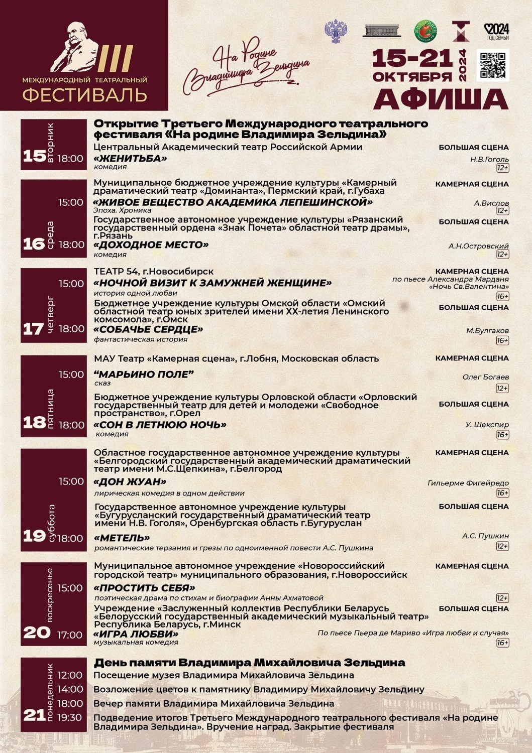 В Мичуринске пройдет III Международный театральный фестиваль «На Родине Владимира Зельдина» (12+). Участие примут театры из разных регионов России, ожидается более 300 участников.
