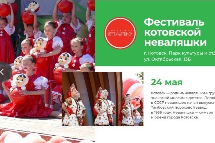 В Котовске в субботу, 24 мая, в шестой раз пройдет фестиваль неваляшки (0+). В программе городского фестиваля: экскурсии в историю русской неваляшки, концерты, полеты на воздушном шаре, выступления спортсменов, фокусники и файер-шоу, пишет котовское издание «Наш вестник».