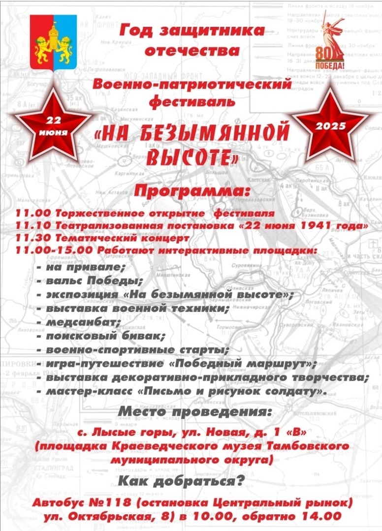 В это воскресенье, 22 июня, в Притамбовье состоится военно-патриотический фестиваль «На безымянной высоте» (12+), посвященный 80-летию Великой Победы.