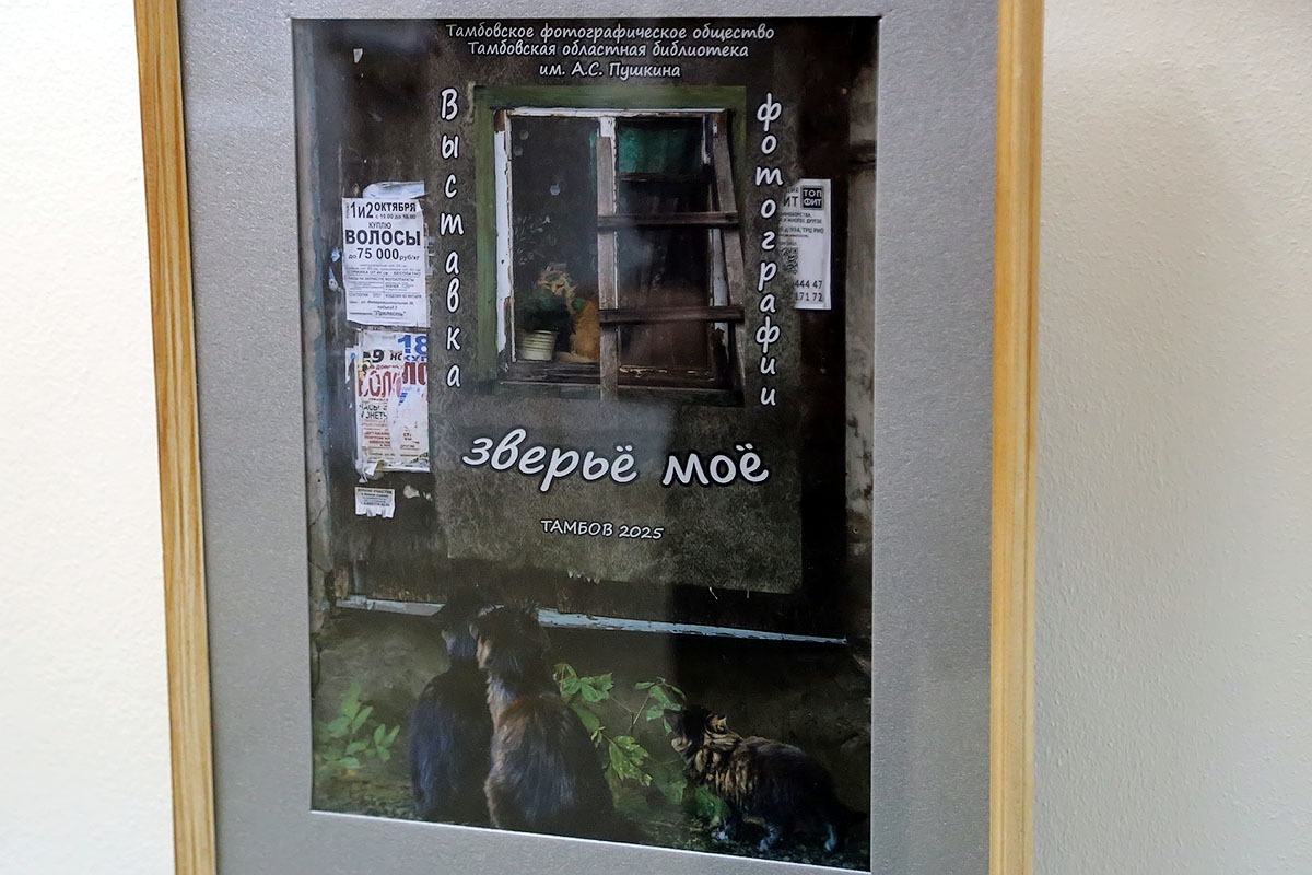 Необычная фотовыставка (0+) открылась в среду, 15 октября на втором этаже областной научной библиотеки имени Пушкина. Экспозицию «Зверьё моё» представило Тамбовское фотографическое общество в сотрудничестве с работниками библиотеки. А соседствует выставка с картинами известного тамбовского художника и друга Общества Олега Наймушина. Более 30 фоторабот, а точнее фотоисторий о братьях наших меньших представили 19 фотохудожников  из Тамбова, Рассказова, Воронежа, Великого Новгорода, Новомосковска, Ростова-на-Дону и других городов.