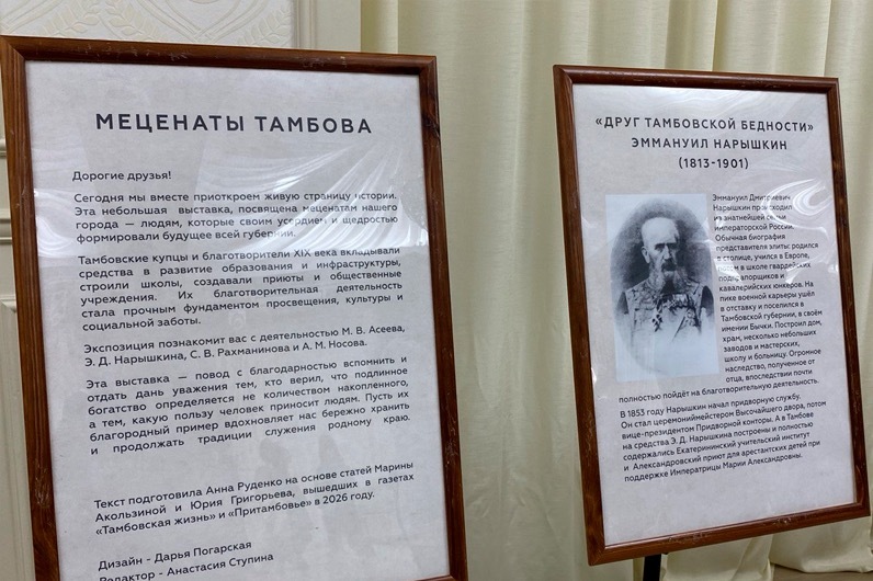 В фойе концертного зала также представили картины тамбовских художников, которые можно было приобрести, и небольшую выставку об известных тамбовских меценатах.