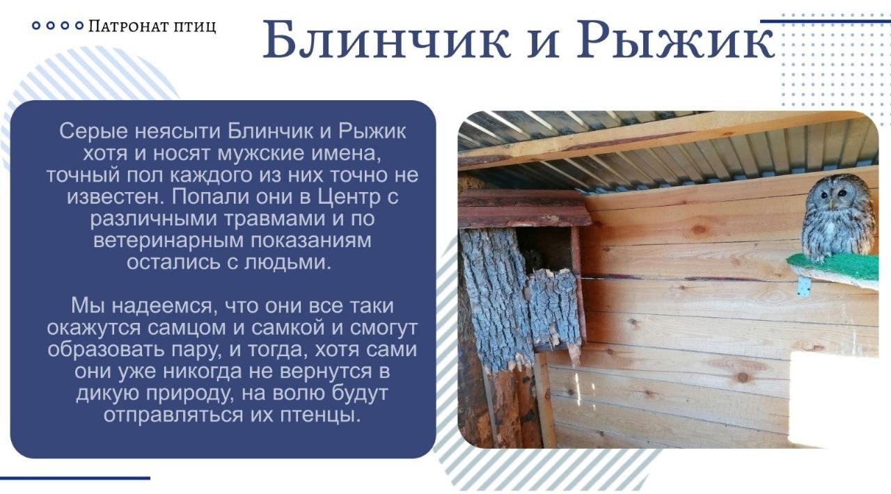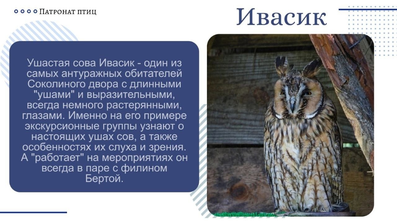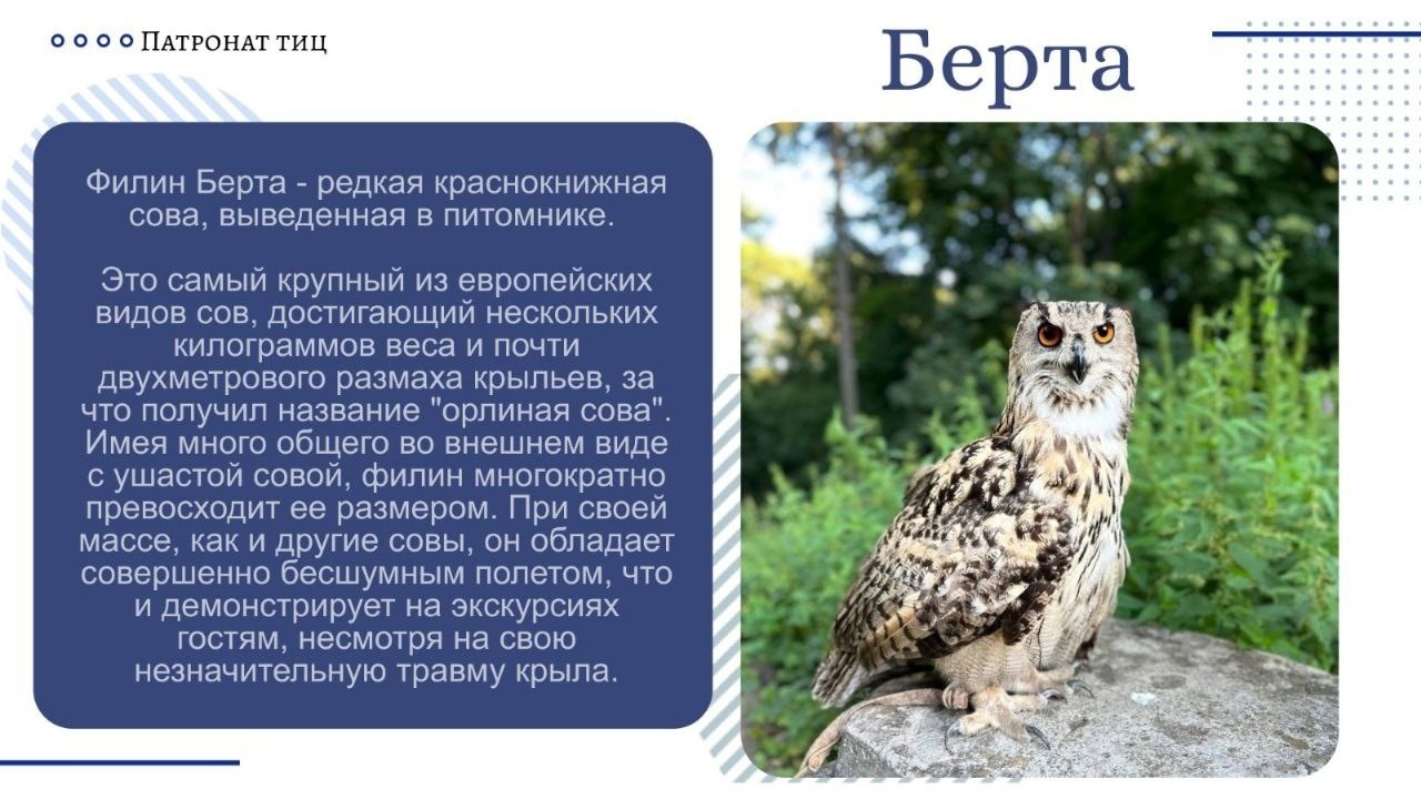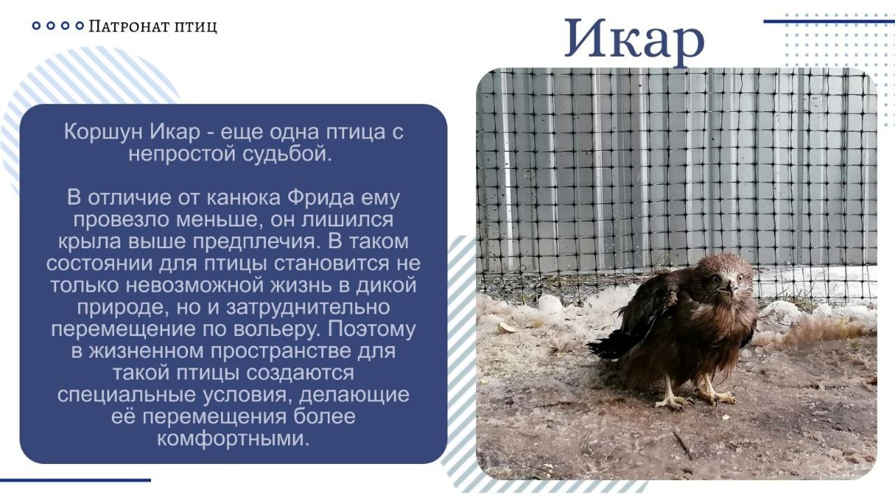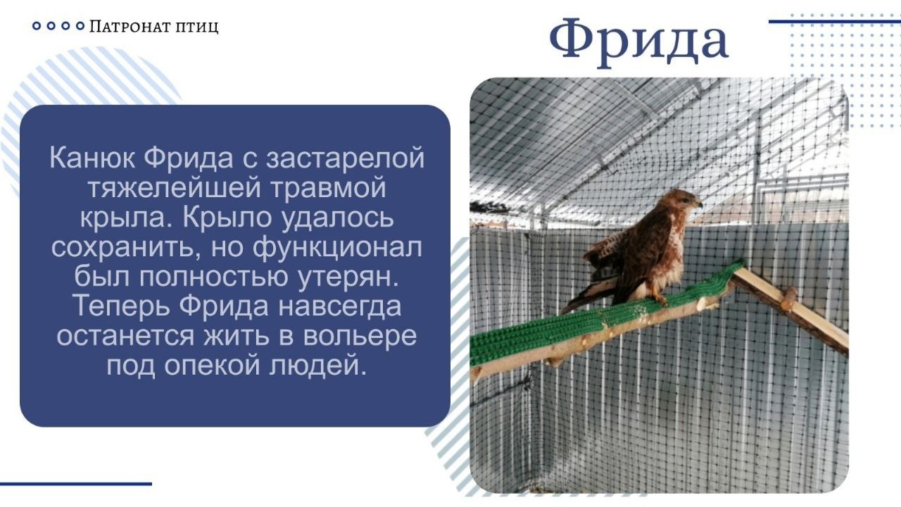 Что подразумевает под собой понятие — взять птицу под патронат? Это означает, что взявший шефство будет спонсировать содержание птицы и заботиться о ней: приобретать качественный корм, обустраивать комфортное место для проживания и обеспечивать требующимися ветеринарными услугами. Это уникальная возможность дать уязвимой птице лучшую жизнь, а также поближе познакомиться с миром пернатых, научиться лично ухаживать за ними и принять участие в спасении ценных видов хищников.