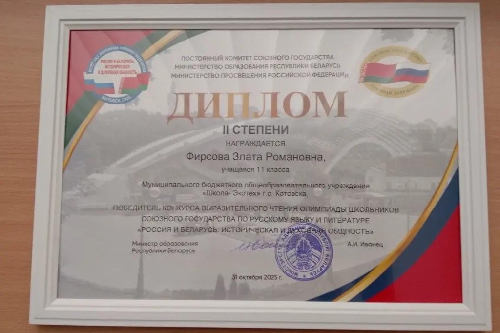 В Витебске 31 октября подвели итоги финального этапа олимпиады школьников Союзного государства «Россия и Беларусь: историческая и духовная общность». Второе место в конкурсе заняла ученица Котовской «Школы-ЭКОТЕХ» Злата Фирсова.