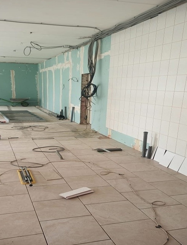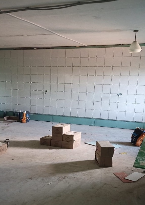 В селе Бахмутовка провели облицовку стен гипсокартонном. Продолжается укладка настенной и напольной плитки.