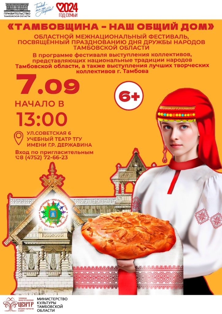 В учебном театре Державинского университета 7 сентября в 13:00 пройдёт заключительный праздник ежегодного областного межнационального фестиваля «Тамбовщина — наш общий дом» (6+). Он посвящён Дню дружбы народов Тамбовской области. Участниками станут около 600 человек.