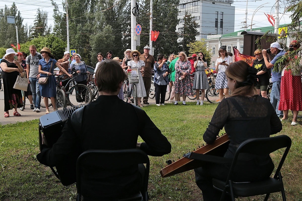 Музыкальное сопровождение велопробега продолжалось на всём его протяжении, благодаря городским властям и ТГМПИ имени Рахманинова. На площадке у бывшего кинотеатра «Родина» Вера Орлова продолжила рассказ о том, как жил Тамбов в тяжёлые годы войны.