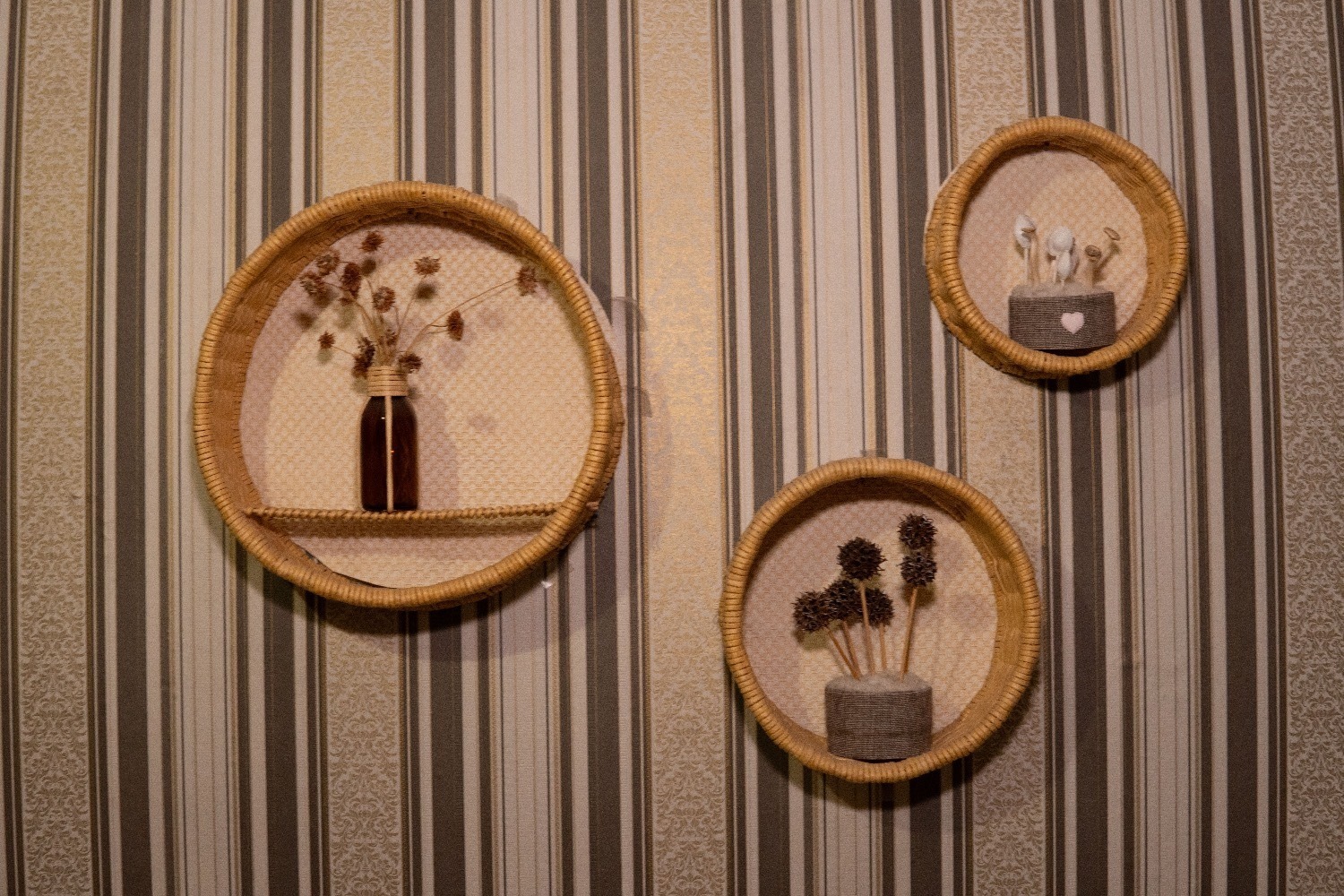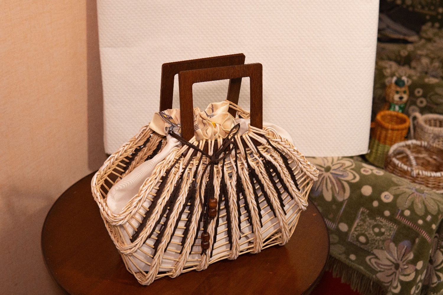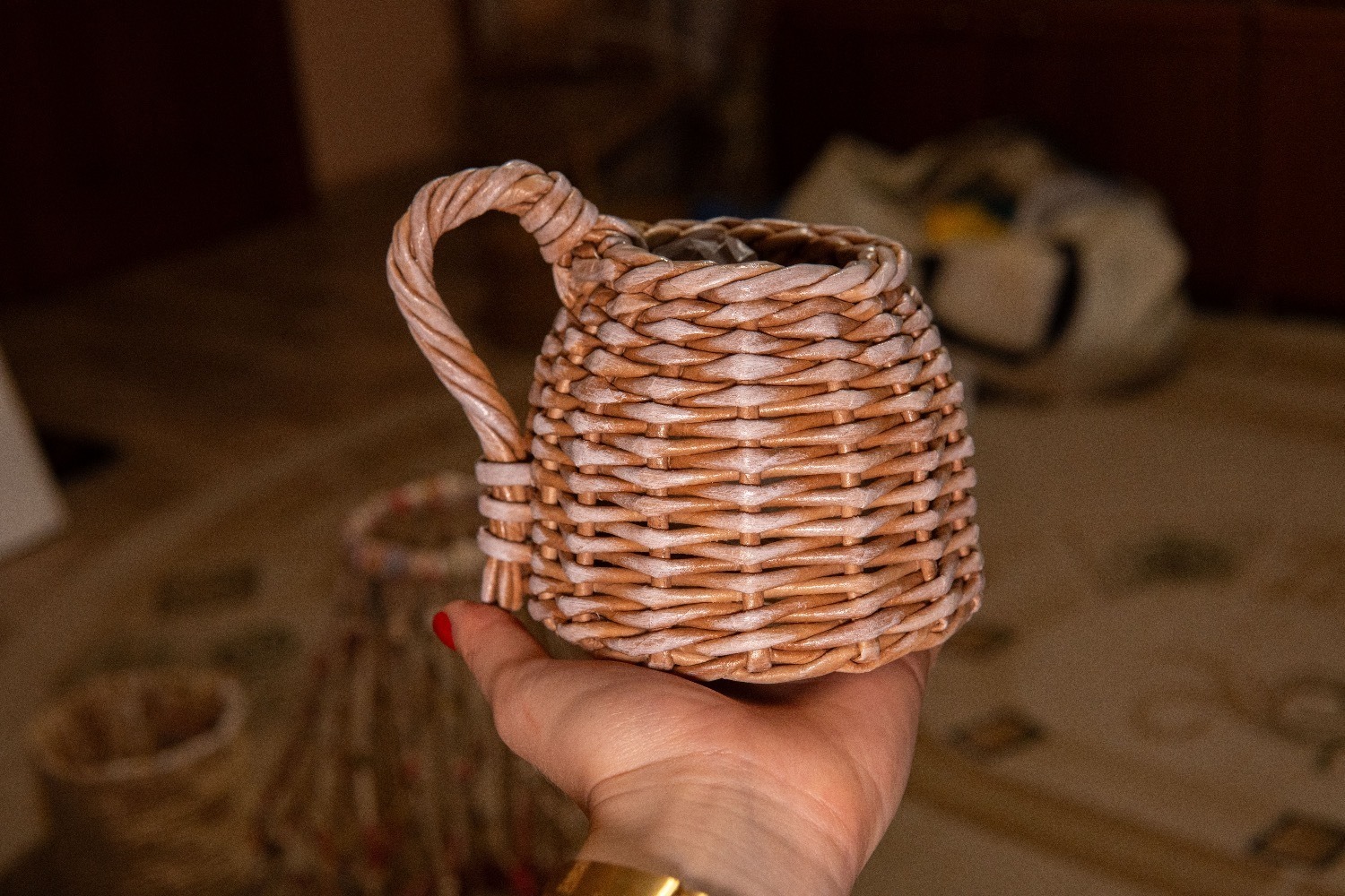 — Раньше просто я накручивала трубочки, брала целый пучок, из пульверизатора увлажняла их и плела, потом покрывала лаком — всё. И тогда все плели из газет, их также закрашивали, газетный принт легко поддаётся краске.