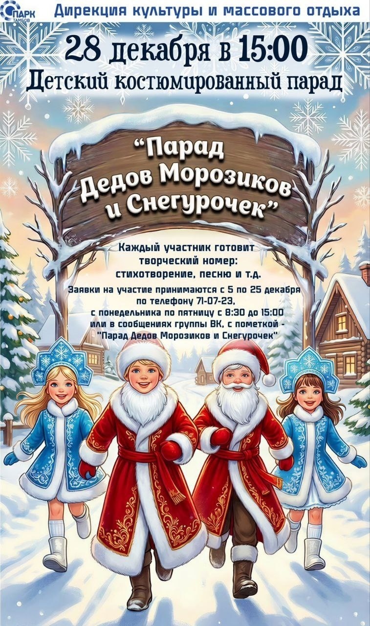 28 декабря в Тамбове в парке культуры и отдыха пройдет детский костюмированный парад Дедов Морозиков и Снегурочек (0+). Каждый участник должен прийти в новогоднем костюме и показать оригинальный номер: рассказать стихотворение, спеть или исполнить танец.