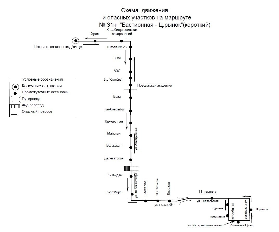 Автобус будет следовать от Центрального рынка до Полынковского кладбища по улицам Красная, Интернациональная, Носовская, Октябрьская, Гастелло, 40 лет Октября, Авиационная, Бастионная и обратно.